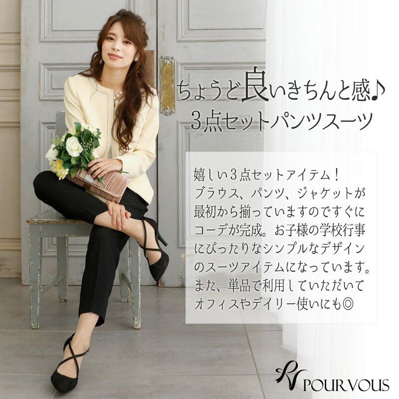 体型カバーポイント ------------------------------------------------------------ 嬉しい3点セット!ブラウス、パンツ、ジャケットが揃っているので買ってすぐ着る事ができます。