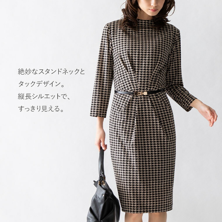 ワンピース:ケリーX-Line スタンドネック ハウンドトゥースチェック ◆opr13-050003きれいめ 30代 40代 50代 着やせ 大人 上品 エレガント 大きいサイズ トールサイズありタイトワンピース ジャージー 幾何学 オフィス ハイネック ボトルネック 膝丈 七分袖 春 秋冬