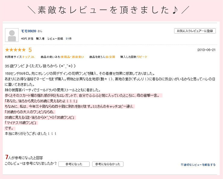 このデザインはウェスト周りなど体にピッタリする箇所は無いのに、ほっそり見えて驚きました。